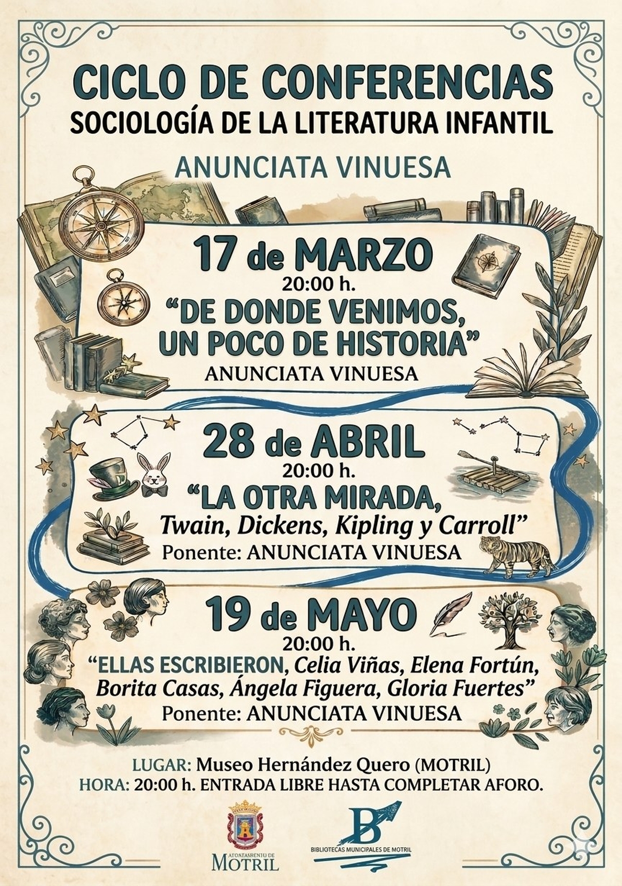 Motril acoge 3 conferencias, a cargo de Anunciata Vinuesa, en el Centro de Arte José Hernández Quero a las 20:00 horas con entrada libre hasta completar el aforo, con el objetivo de analizar la evolución histórica y social de la literatura dirigida a la infancia.